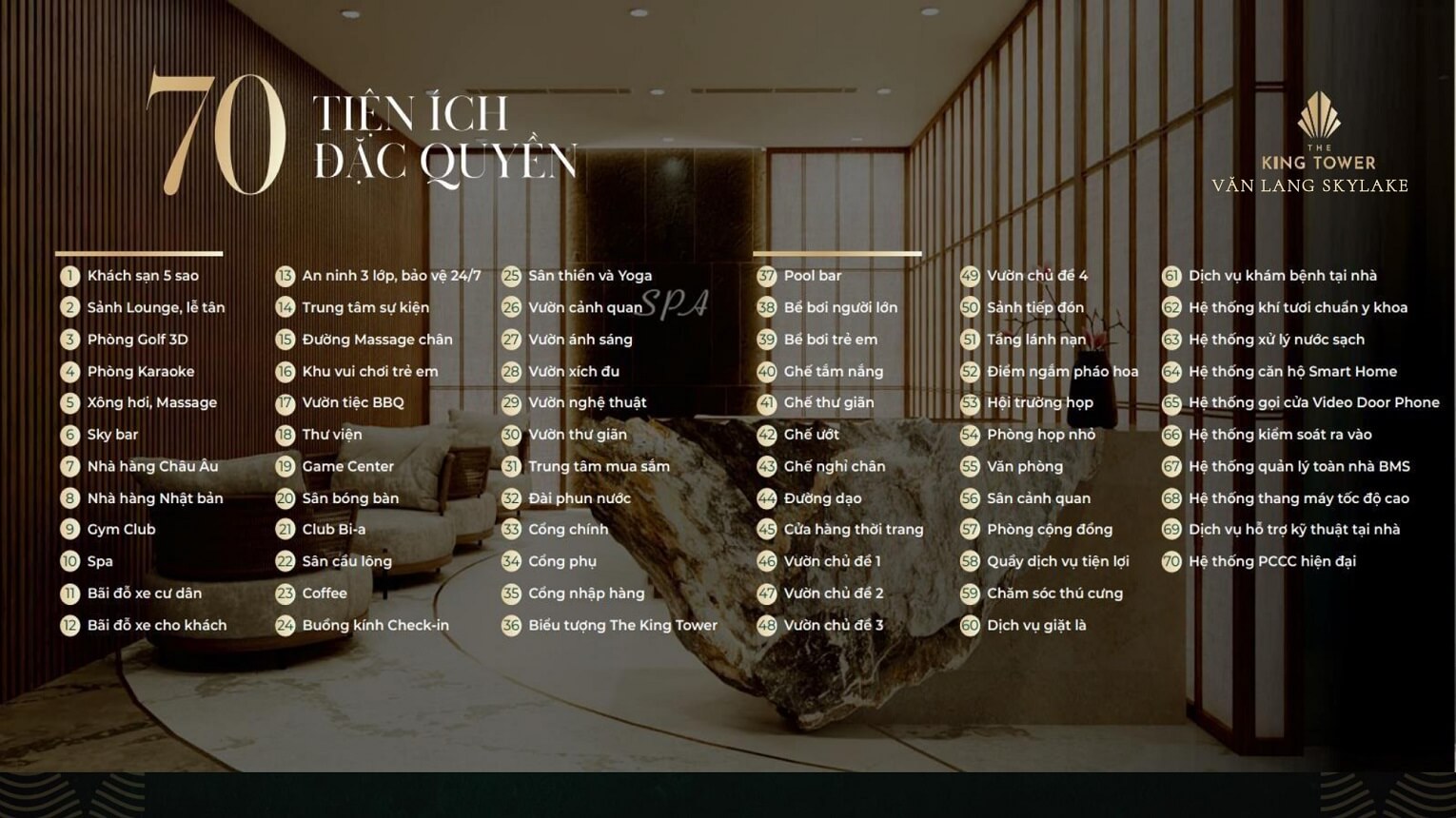 • Văn Lang SkyLake là khu đô thị tiên phong mang đến trải nghiệm sống quốc tế tới Phú Thọ. Với những tiện ích đẳng cấp, đi kèm công nghệ smart home hiện đại đón đầu xu hướng, Văn Lang SkyLake là dấu ấn nổi bật với tổ hợp tháp đôi căn hộ cùng khu thương mại cao cấp, song hành cảnh quan xanh độc đáo được thiết kế bởi những tên tuổi hàng đầu thế giới.