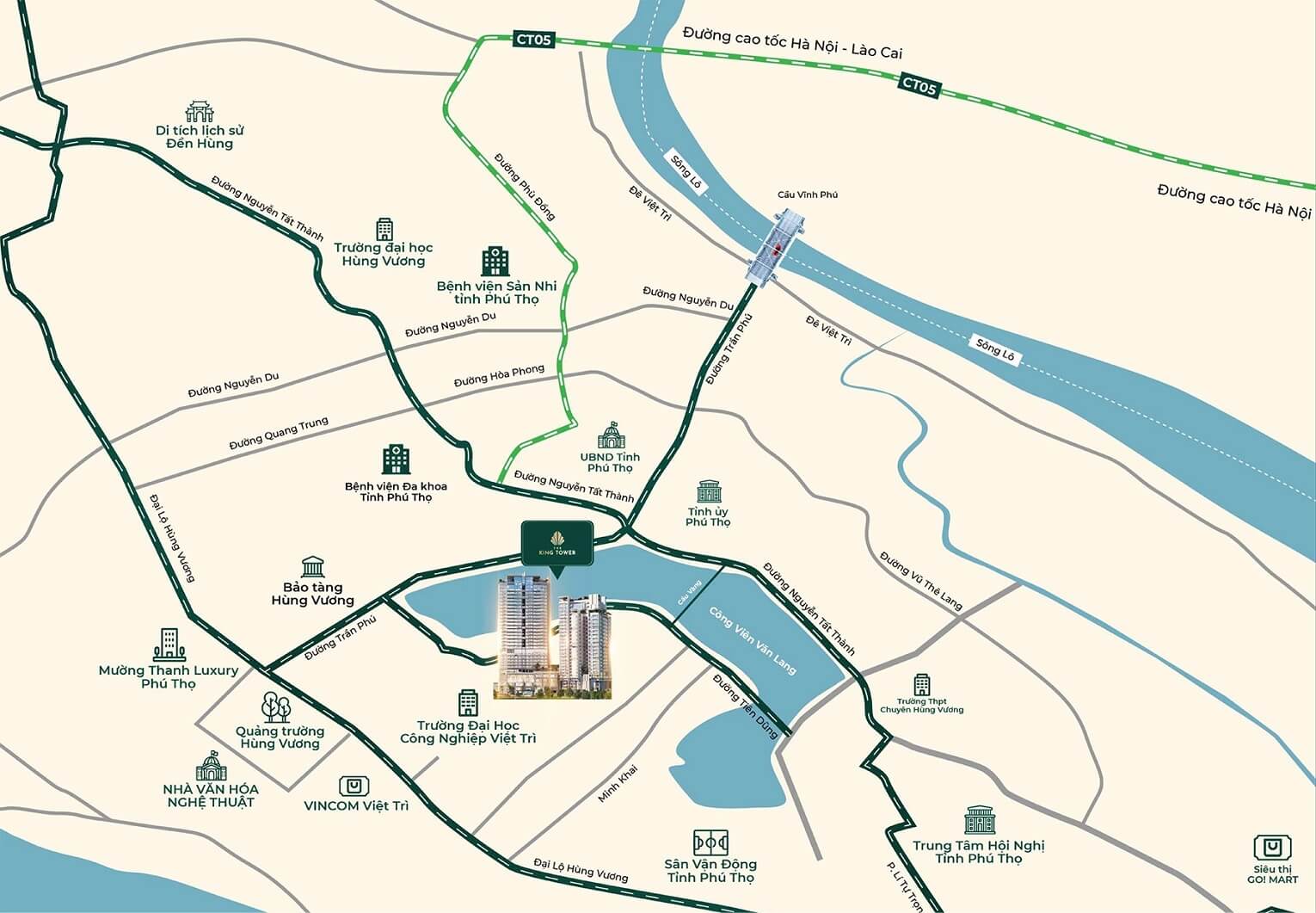 Văn Lang Skylake tọa lạc tại đường Tiên Dung, phường Tiên Cát, thành phố Việt Trì, tỉnh Phú Thọ. Dự án hướng trực diện ra công viên hồ điều hòa Văn Lang tuyệt đẹp, sát bên “lá phổi xanh” của thành phố, tổ hợp quy mô trực tiếp thụ hưởng một khuôn viên thiên nhiên mát lành “độc nhất vô nhị”. Chung cư The King Tower sở hữu thế đất cao tựa sơn – hướng thủy, có mặt trước hướng nhìn ra hồ điều hòa Công viên Văn Lang rộng 116,2 ha và mặt sau “thế tựa núi” Ninh Nghĩa.
